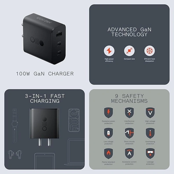 - 🔥 Enhanced Protection & Less Heat Generation : Stay worry-free while charging. The CMF by Nothing 100W GaN charger offers protection against short circuits, overheating, excessive currents, high and low voltage, and even features a flame-retardant shell for added safety.